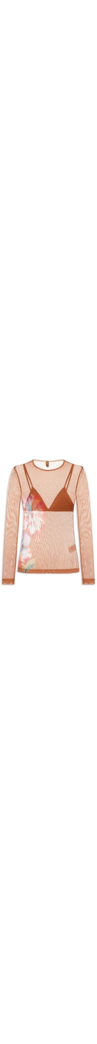 A blusa marrom é confeccionada em tule com média elasticidade. A peça justa ao corpo possui decote redondo, mangas longas, estampa figurativa em cores contrastantes e transparência.