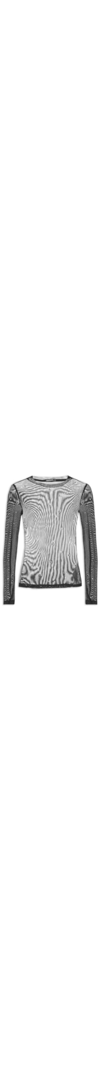 A blusa preta é confeccionada em tule com alta elasticidade A peça justa ao corpo possui decote redondo, mangas longas, transparência e aplicações de cristais.