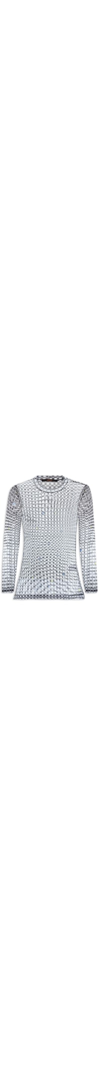 A blusa preta é confeccionada em tule com média elasticidade. A peça justa ao corpo possui decote redondo, mangas longas, padronagem xadrez em cores contrastantes e transparência.