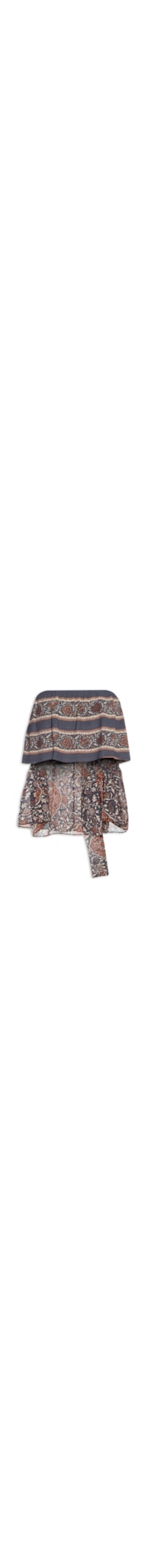 A blusa azul é confeccionada em tecido leve sem elasticidade. A peça solta ao corpo possui decote reto com tecido sobreposto e elástico embutido no busto, fendas laterais e padronagem abstrata em cores contrastantes.