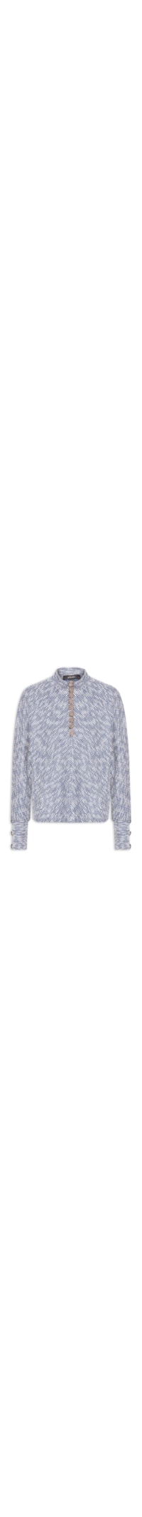 A blusa cinza é confeccionada em tweed com fios de lurex e sem elasticidade.A peça solta ao corpo possui gola alta, mangas longas com ajuste e botões aplicados nos punhos, recorte posterior, padronagem em cor contrastante e fechamento frontal por botões.