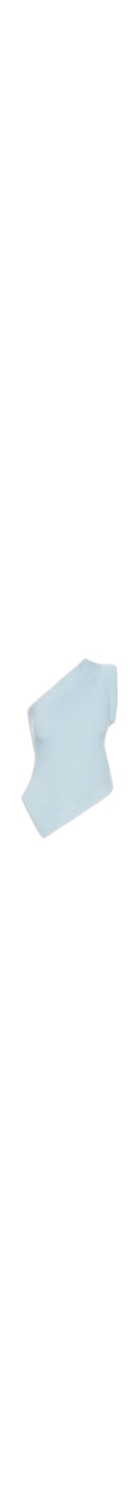 A blusa azul é confeccionada em tricot com alta elasticidade. A peça justa na parte do busto e solta na parte inferior possui decote ombro único com recorte com enchimento e barra assimétrica.