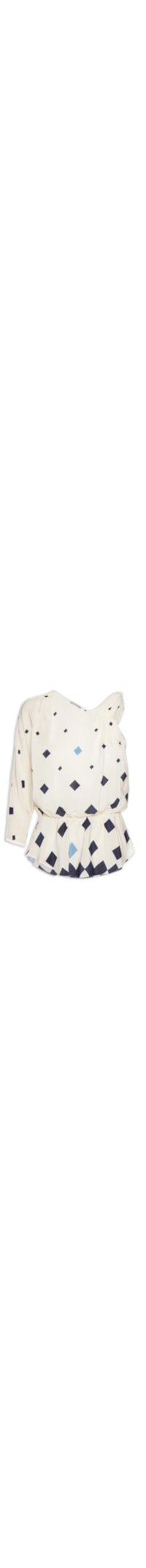 A blusa branca é confeccionada em seda sem elasticidade. A peça solta ao corpo, de modelo ombro único, possui decote canoa, manga ampla de comprimento 7/8 com leve transparência, alça média com pregas e nó posterior, elástico embutido na barra com peplum, estampa geométrica em tons de azul, barra arredondada e forro.