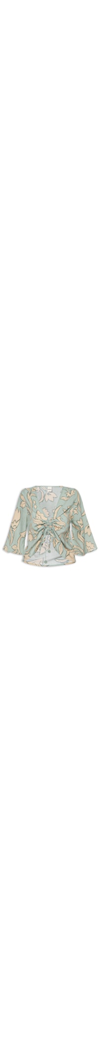 A blusa verde é confeccionada por tecido leve com toque em linho sem elasticidade. A peça solta ao corpo possui decote v, mangas curtas, detalhe franzido com cordão para ajuste, estampas figurativas florais em cor contrastante e comprimento cropped*.