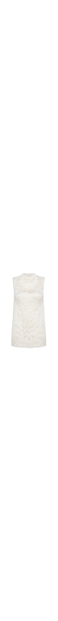 A regata bege é confeccionada em tecido leve, com superfície acetinada, efeito wrinkled* e sem elasticidade. A peça solta ao corpo, possui decote redondo, cavas estendidas, fenda lateral, comprimento alongado e recorte posterior vazado com fechamento por botões.