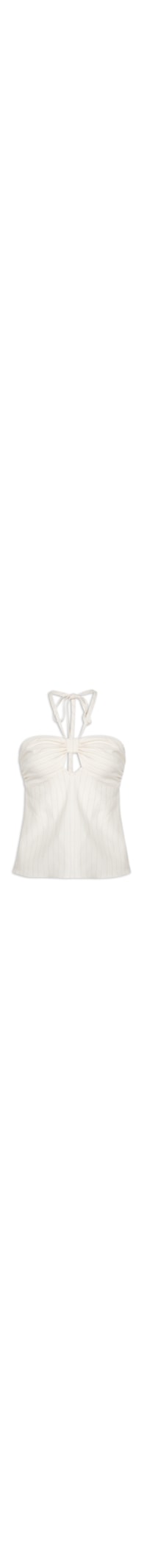 A blusa off white é confeccionada em tecido leve com toque de linhio sem elasticidade. A peça solta ao corpo, de modelo frente única, possui decote halter, alças finas estendidas para amarração posterior, recorte vazado na parte frontal do busto com detalhe aplicado franzido, franzido nas laterais, lastex aplicado na parte posterior, padronagem de listras em cor contrastante, forro superior e leve transparência.