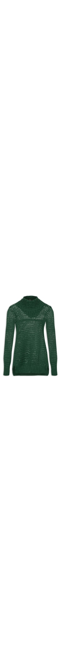 A blusa verde é confeccionado em tricot com alta elasticidade. A peça solta ao corpo possui gola alta, mangas longas, fendas na barra e acabamento canelado nos punho e barra.