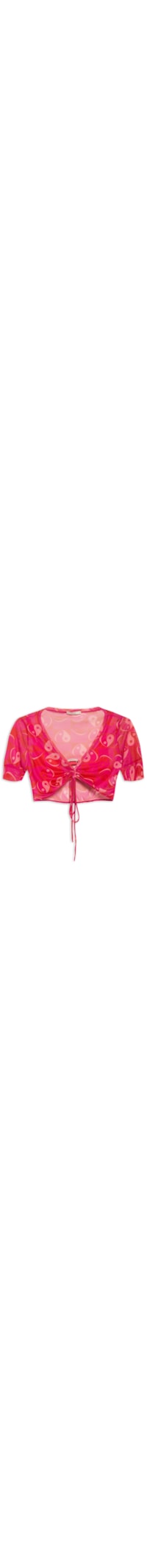 A blusa rosa é confeccionada em tule. A peça possui decote V com cordão embutido para ajuste de franzido, mangas curtas, padronagem figurativa em cores contrastantes, shape solto, caimento reto, comprimento cropped e acabamento pespontado. Acompanha top rosa de formato triângulo em malha canelada com alças finas reguláveis.