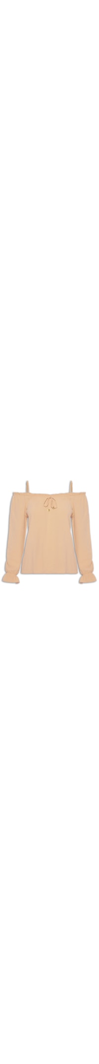 A blusa bege é confeccionada em tecido leve. A peça possui decote ombro a ombro, alças finas ajustáveis, mangas longas, detalhe de tira de amarração na parte frontal, shape solto, caimento reto e acabamento pespontado.