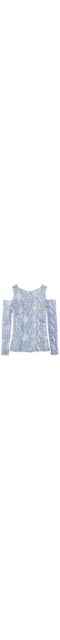 A blusa azul é confeccionada em tule. A peça possui decote canoa, recortes vazados na parte frontal, mangas longas, estampa animal print em cor contrastante, transparência, shape solto, caimento reto e acabamento overlocado.