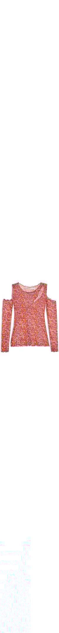 A blusa rosa é confeccionada em tule. A peça possui decote canoa, recortes vazados na parte frontal, mangas longas, estampa abstrata em cor contrastante, transparência, shape justo, caimento reto e acabamento overlocado.