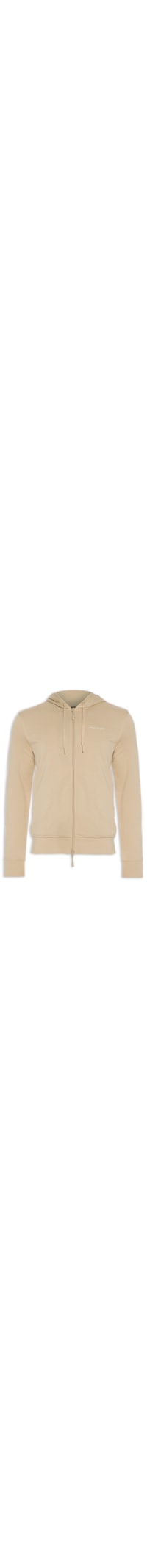 A blusa bege é confeccionada em moletom de média elasticidade. A peça solta ao corpo, possui capuz com cordões embutido para amarração frontal, mangas longas com punho afunilado, logo da marca aplicado em relevo na altura do tórax, bolsos frontais embutidos e fechamento frontal por zíper.