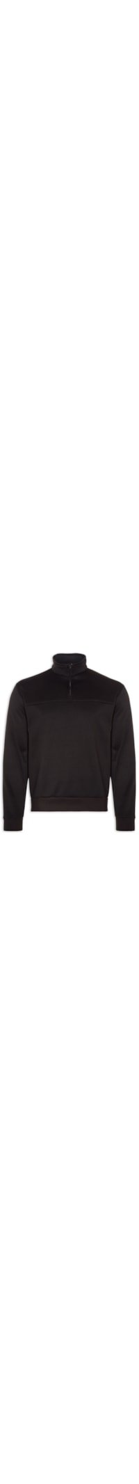 A blusa preta é confeccionado em moletom. A peça possui gola alta, mangas longas, recorte frontal, shape solto, caimento reto, acabamento canelado e fechamento frontal por zíper.