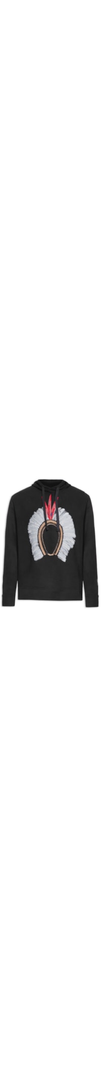 A blusa preta é confeccionada em moletom de média elasticidade. A peça solta ao corpo possui capuz com tira alongada embutida para ajuste e amarração, ombros estendidos, mangas longas com aplicação em silk do nome da marca em tom contrastante, estampa frontal figurativa de cocar em tons contrastantes com detalhes de bordados em relevo e acabamento canelado.