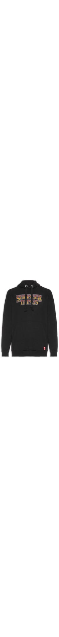 A blusa preta é confeccionada em moletom.A peça possui capuz aplicado com cordão embutido, ombros estendidos, mangas longas, bolsos frontais de modelo canguru, estampa com nome da marca em cores contrastantes aplicada na parte frontal, tag da marca aplicada na parte frontal,, shape solto, caimento reto e acabamento canelado.