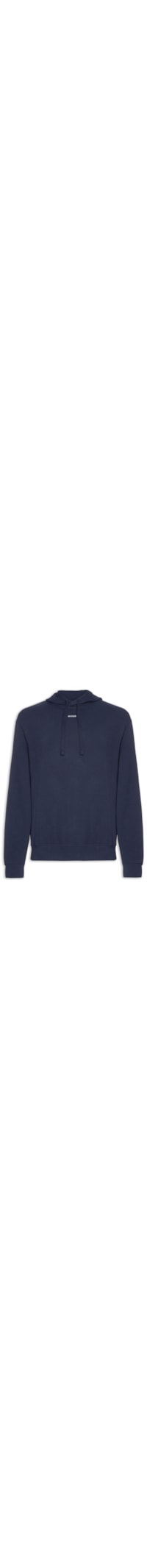 A blusa azul é confeccionada em malha de algodão com média elasticidade. A peça solta ao corpo possui capuz com cordão alongado embutido para ajuste, ombros embutidos, mangas longas, nome da marca emborrachado aplicado em cor contrastante na parte frontal e acabamento canelado.