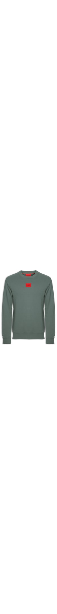 A blusa verde é confeccionada em moletom sem elasticidade. A peça solta ao corpo possui gola careca, mangas longas com ajuste nos punhos e tag da marca bordada na parte frontal.