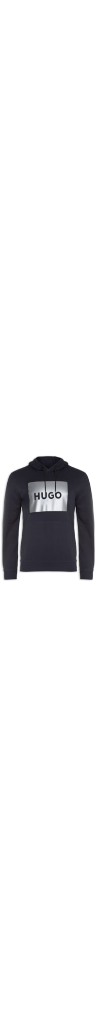 A blusa azul marinho é confeccionada em moletom. A peça possui capuz com cordão embutido para ajuste, mangas longas, nome da marca aplicado com superfície metalizada na parte frontal, bolso frontal de modelo canguru, punhos e barra com acabamento canelado, shape solto, caimento reto e acabamento pespontado.