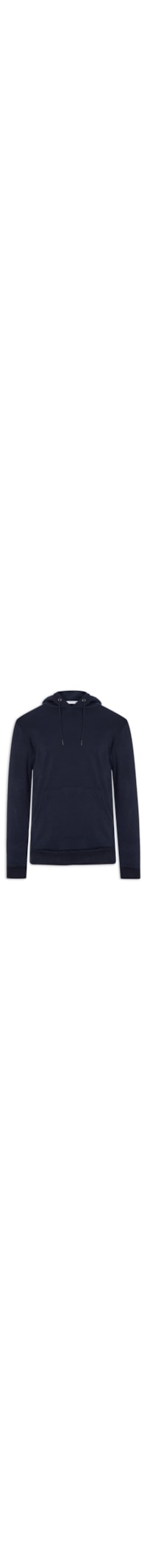 A blusa azul é confeccionada em moletom de média elasticidade. A peça solta ao corpo, possui capuz com cordões embutidos, ponteira metálica nos cordões, mangas longas, bolso canguru na parte frontal e acabamento canelado.