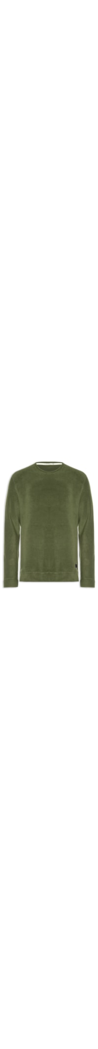 A blusa verde é confeccionada em moletom fleece. A peça possui gola careca, mangas longas com ajuste nos punhos, tag da marca aplicada em borracha com cor contrastante na parte frontal na altura da barra, shape solto, caimento reto e acabamento canelado.