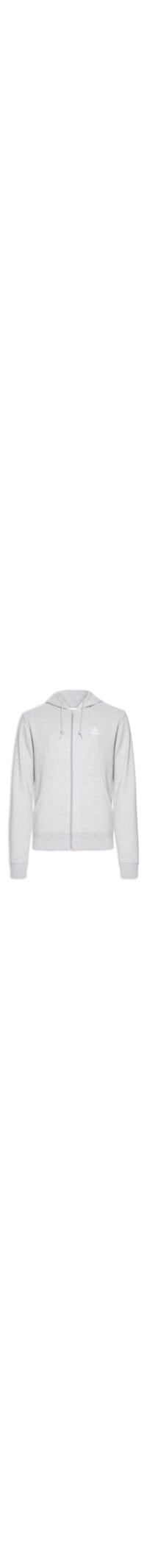 A blusa cinza é confeccionada em moletom de baixa elasticidade. A peça solta ao corpo possui capuz com tira alongada embutida para ajuste, bolsos frontais, nome e logo da marca bordados na parte frontal em tom contrastante, acabamento canelado e fechamento frontal em zíper.