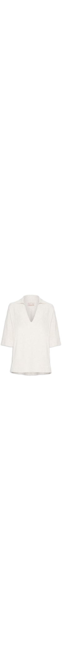 A blusa bege é confeccionada em tecido leve com toque de linho sem elasticidade. A peça solta ao corpo, possui gola V com colarinho, ombros estendidos, mangas 3/4 amplas, recortes frontais com detalhe de nervuras e recorte posterior.