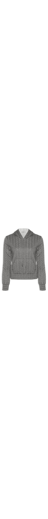 A blusa cinza é confeccionada em moletom com superfície em relevo. A peça possui capuz aplicado com cordões para ajuste, mangas longas com punho elástico, bolso frontal modelo canguru, barra elástica, shape solto, caimento reto e acabamento pespontado.