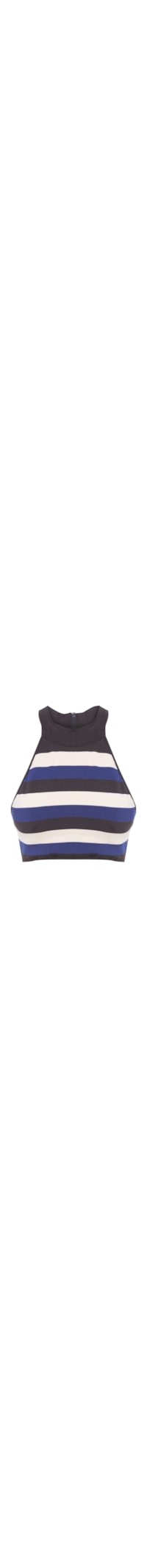 O top preto é confeccionado em tricot. A peça possui decote redondo, faixa aplicada na parte posterior, padronagem de listras, comprimento cropped, acabamento canelado e fechamento por zíper posterior.