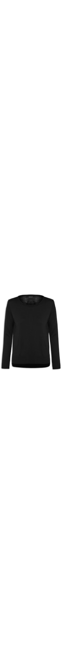 A blusa preta é confeccionada em tricot. A peça possui decote redondo, mangas longas, fendas laterais, barra mullet, shape solto, caimento reto e acabamento canelado.