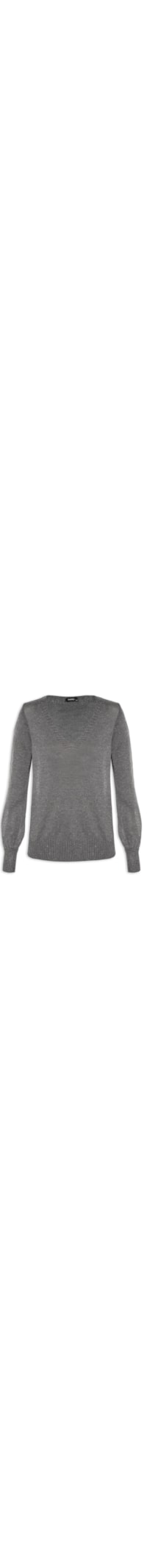 A blusa cinza é confeccionada em tricot. A peça possui decote V, mangas longas, detalhe de mescla em cor ocntrastante, shape solto, caimento reto e acabamento canelado.