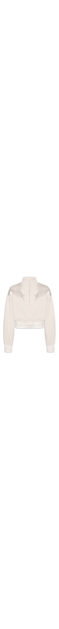 A blusa bege é confeccionada em malha de algodão com acabamento canelado, com baixa elasticidade. A peça solta ao corpo possui decote alto, recortes na parte frontal e posterior em tecido leve com superfície acetinada, mangas longas, elástico embutido nos punhos e cintura, tag da marca aplicada em metal na parte posterior, comprimento *cropped, fechamento frontal por zíper.
