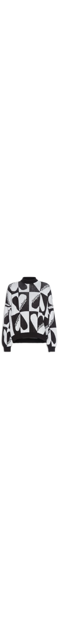 A blusa preta é confeccionada em tricô acrílico de alta elasticidade. a peça solta ao corpo de modelo oversized* possui gola alta, mangas largas justas no punho, tag da marca aplicada à parte posterior, estampa figurativa de corações em cores contrastantes, comprimento longo com barra justa, sem forro, sem fechamento.