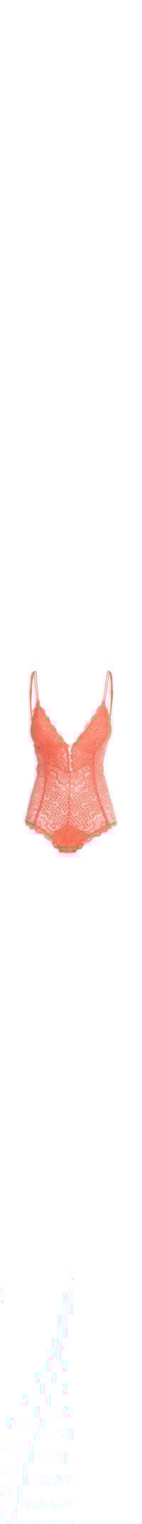 O body laranja é confeccionado em renda. A peça possui decote em V profundo, alças finas com regulagem, bojo removível, tag da marca aplicada em metal na parte frontal, recortes frontais e posterior, shape justo, caimento reto, acabamento elástico e fechamento frontal por botões e inferior por colchetes.