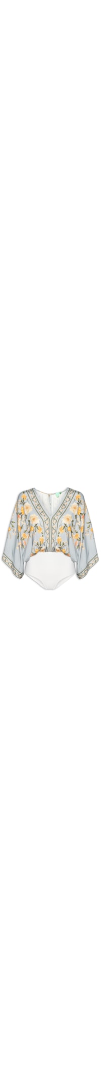 O body azul é confeccionado em tecido leve sem elasticidade. A peça justa na altura da cintura e solta no comprimento possui decote V profundo, mangas 3/4 amplas, recorte posterior vazado com botão aplicado, estampa floral em cores contrastantes e recorte inferior na cor off white.