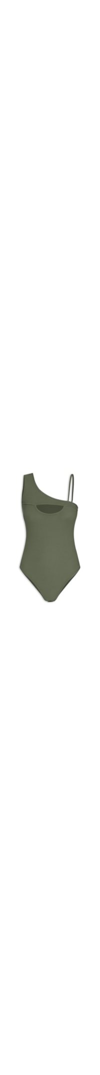 O body verde é confeccionado em malha canelada. A peça possui decote assimétrico, alça média e fina, cavas regulares, recorte frontal vazado, shape justo e fechamento inferior por botões de pressão
