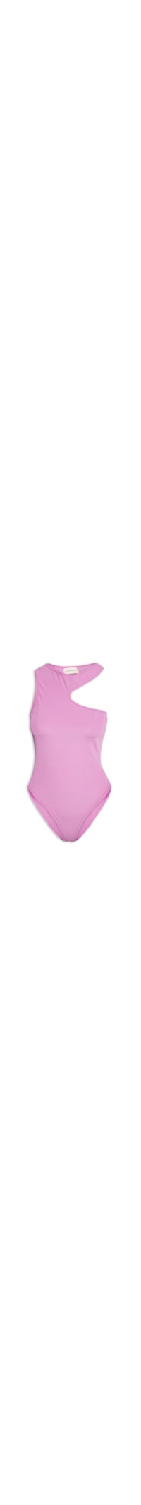 O body lilás é confeccionado em malha canelada. A peça possui decote redondo, alças médias, cavas regulares, detalhe de assimetria na parte frontal e posterior, shape justo, caimento reto, acabamento pespontado e fechamento inferior por botões de pressão.