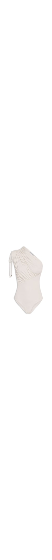 O body bege é confeccionado em malha com alta elasticidade. A peça justa ao corpo possui decote ombro único, alça larga com cordão embutido para amarração, sem bojo, recorte assimétrico na altura da cintura, franzidos na altura do ombro e da cintura, drapeado nas partes posterior e frontal e fechamento inferior por botões de pressão.