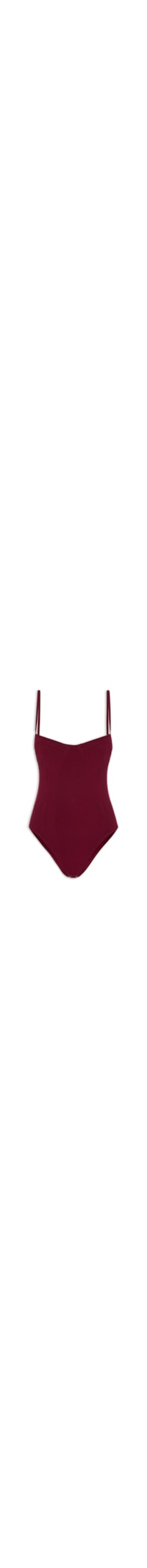 O body vinho é confeccionado em malha com superfície canelada e de média elasticidade. A peça justa ao corpo possui decote coração, alças finas, recortes frontais na altura do busto, forro superior, sem bojo e fechamento inferior por botões de pressão.