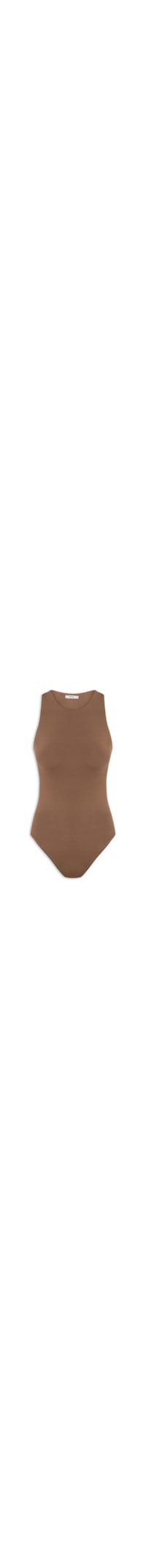 O body marrom é confeccionado em malha leve com média elasticidade. A peça justa ao corpo possui decote U, alças médias, cavas estendidas e fechamento inferior por botões de pressão.