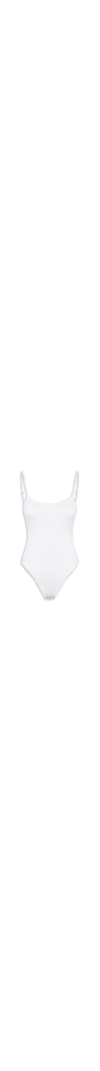O body branco é confeccionado em malha de poliamida com acabamento canelado e alta elasticidade. A peça justa ao corpo possui decote em U, alças finas reguláveis, cavas estendidas e fechamento inferior por botão de pressão.