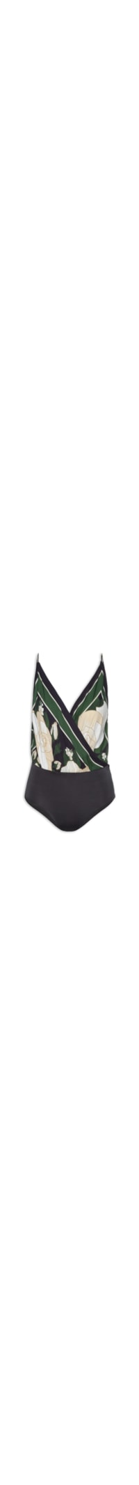 O body preto é confeccionado em tecido leve sem elasticidade. A peça justa ao corpo possui decote frontal V transpassado e posterior reto, alças finas com regulagem, cavas estendidas, mix de estampas nas cores verde, bege e off white, elástico embutido na altura da cintura com detalhe de franzido e recorte inferior em malha preta com alta elasticidade.