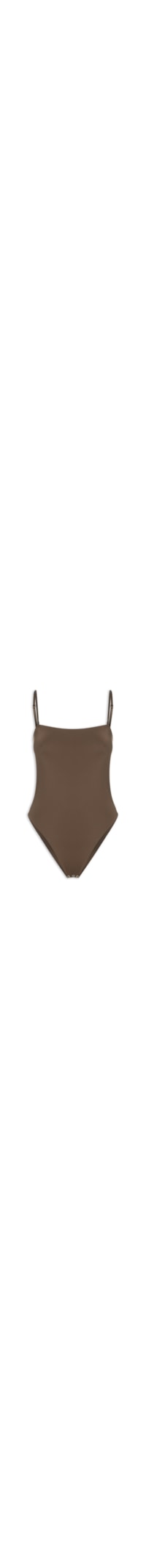 O body marrom é confeccionado em malha de poliamida com alta elasticidade. A peça justa ao corpo possui decote em reto com elástico embutido, alças finas reguláveis e removíveis, forro e fechamento inferior por botão de pressão.