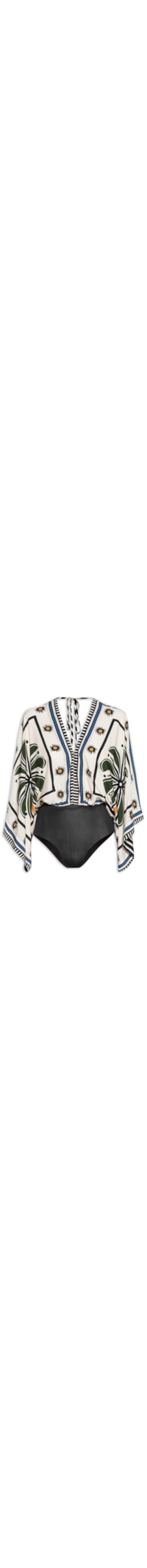 O body off white é confeccionado em tecido leve sem elasticidade. A peça solta ao corpo possui decote V, mangas 3/4 de modelo morcego, decote posterior em V profundo com tiras aplicadas para amarração, parte inferior em malha, mix de estampa em cores contrastantes e fechamento inferior por botões de pressão.