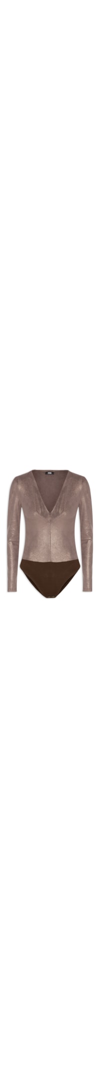 O body marrom é confeccionado por tecido leve com superfície em fios lurex e com média elasticidade. A peça justa ao corpo possui decote V, mangas longas, recorte frontal, tag da marca metalizada aplicada na parte posterior, recorte inferior em cor contrastante e fechamento inferior por botão de pressão.