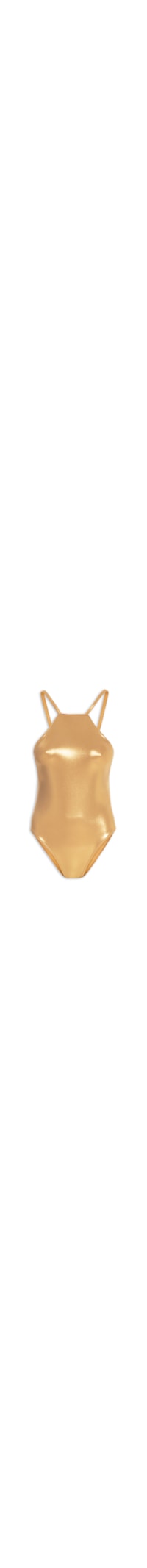 O body dourado é confeccionado em malha cirrê com alta elasticidade e superfície metalizada. A peça justa ao corpo de modelo frente única possui decote halter, alças finas, recorte vazado na região posterior, detalhe de tira com fechamento por aviamento metalizado de encaixe aplicado na região posterior, forro, shape justo, caimento reto, acabamento pespontado e fechamento inferior por botões de pressão.
