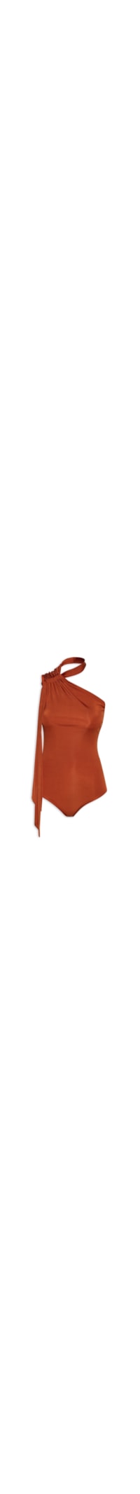 O body laranja é confeccionado em malha leve de alta elasticidade. A peça justa ao corpo, possui decote ombro único com faixa embutida, franzido frontal, forro e fechamento inferior por botões de pressão.