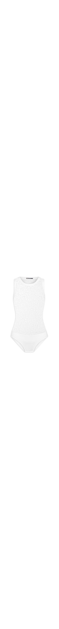 O body branco é confeccionado em renda de média elasticidade. A peça justa ao corpo possui decote redondo, alças médias, tag metálica da marca aplicada na parte posterior, padronagem floral, parte inferior em malha leve, transparência, forro frontal em tule, acabamento canelado e fechamento inferior por botões de pressão.