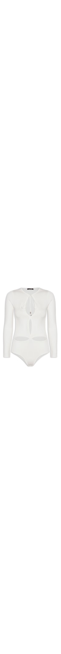 O body off white é confeccionado em tricot. A peça possui decote V, mangas longas, recortes vazados na parte frontal, tag metálica da marca aplicada na parte posterior, detalhe de tira de amarração na parte frontal, shape justo, caimento reto, acabamento pespontado e fechamento inferior por botão de pressão.