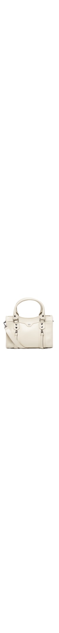 A bolsa off white é produzida em couro. A peça possui tamanho médio, formato retangular, compartimento interno amplo e bolso com fechamento por zíper, alça de mão fixa com argola metalizada, alça de ombro removível com passantes, perfuros e regulável por fivela metálica, detalhes metálicos nas partes frontal, posterior e inferior, faixa média sobreposta nas partes frontal e posterior, detalhe de zíperes aplicados na parte frontal, forro estampado, acabamento pespontado e fechamento superior por zíper.