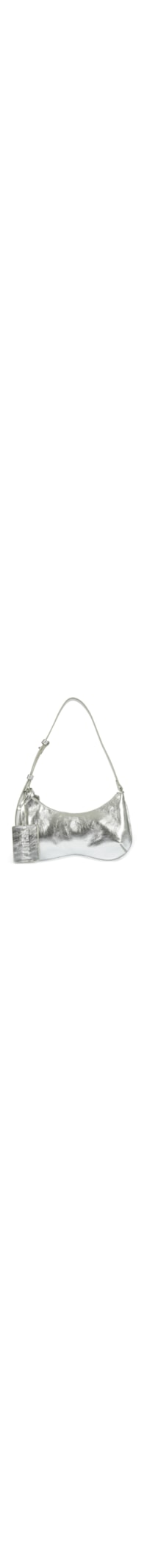A bolsa prateada é confeccionada em material sintético. A peça de modelo tiracolo possui tamanho médio, formato retangular, alça fixa regulável, compartimento interno, acabamento em material metalizado prata e fechamento superior por zíper. Acompanha tag personalizada da marca para uso opcional.